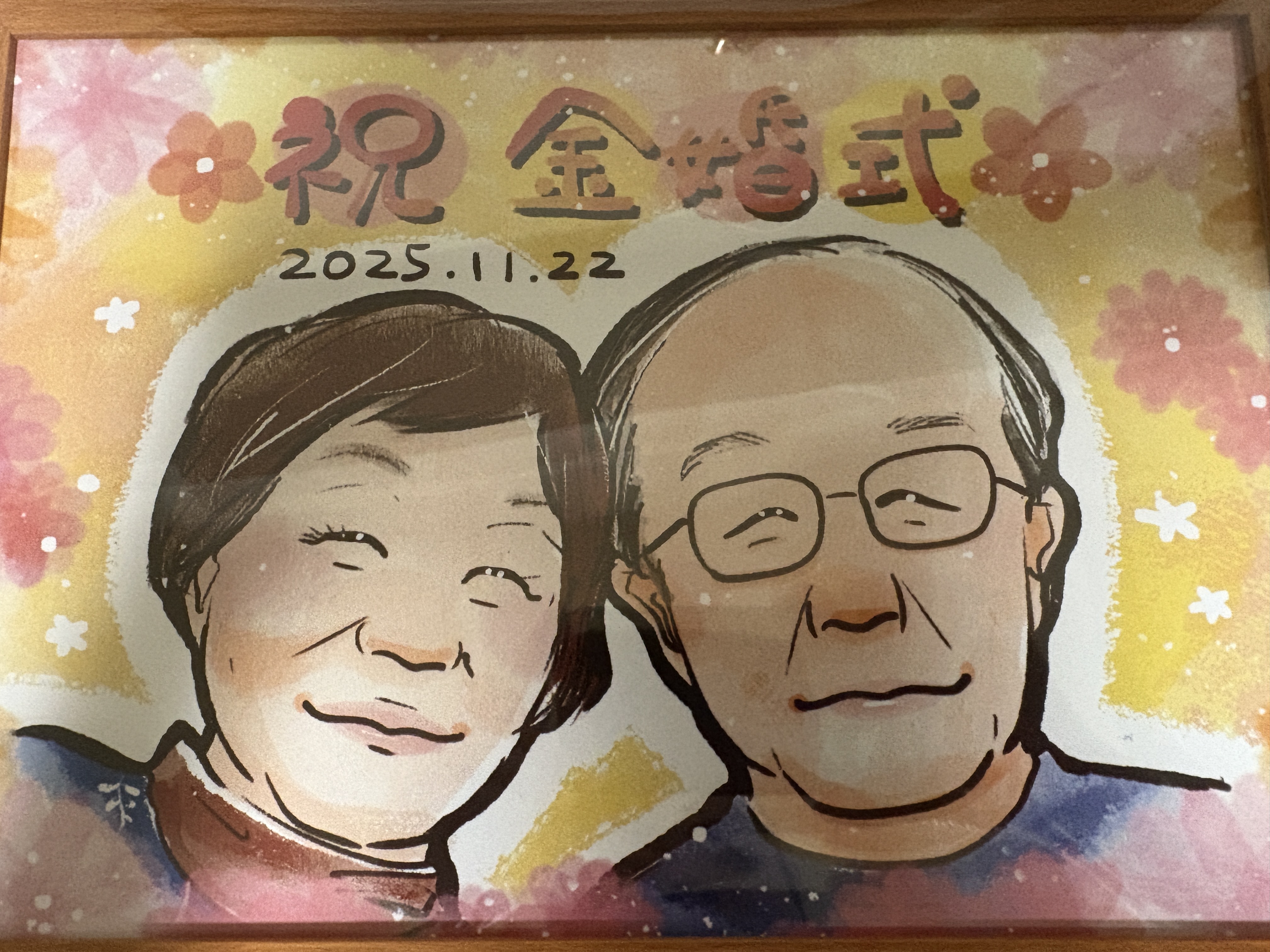 両親の金婚式があり、プレゼント用に似顔絵をお願いしました。 到着まで早く、3日ほどでした。 箱を開け似顔絵を見た時感動しました。 要望通り、とても優しいタッチで大満足です✨額縁やプレゼント用の袋もあり助かりました。 プレゼントするのがとても楽しみです。 また、記念日などにお願いしたいです。 ありがとうございました