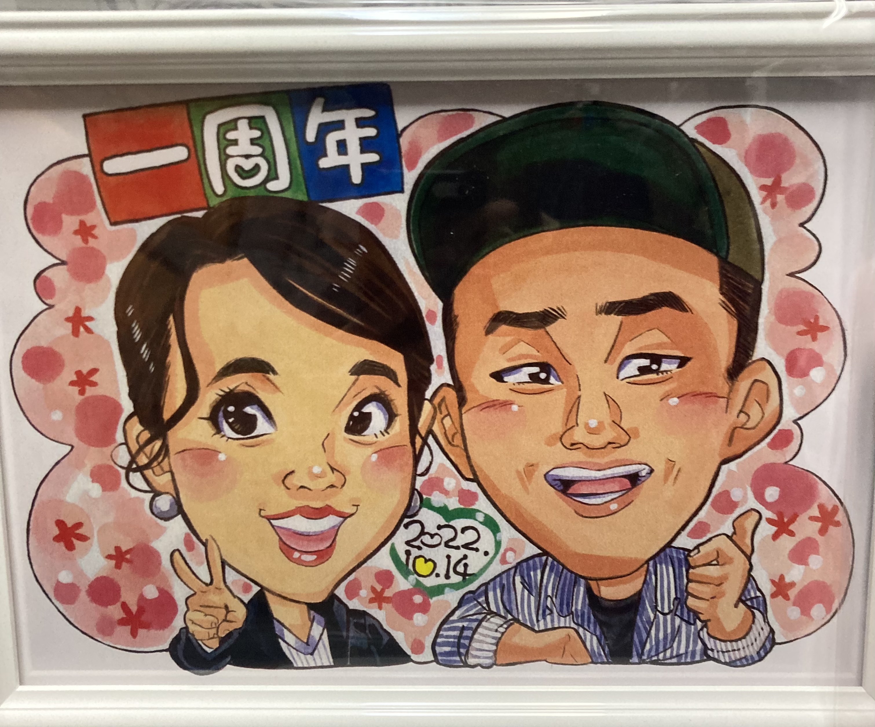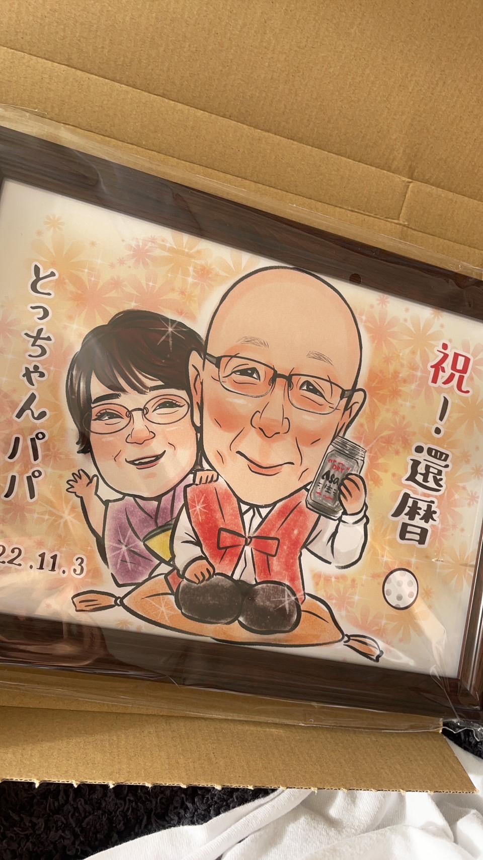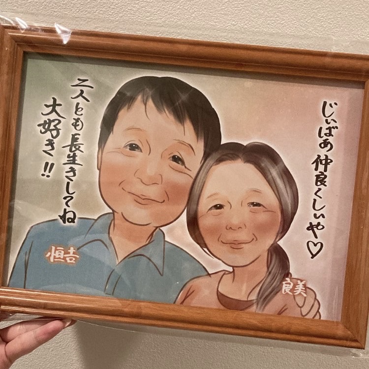 上月先生に『2人最上級の幸せそうな顔に描いて下さい』とお願いしたところ『心を込めて描かせて頂きます。』とのメールを頂きました。1週間足らずで作品が届きました。まず開封した私の目に両親の満面の笑みが飛び込んできて涙が止まりませんでした。早速母に届けたところ作品を観てその場に泣き崩れました。「お父ちゃんが笑ってる…お父ちゃんが笑ってる…」と繰り返しながら。「これでずっとお父ちゃんと一緒に居れる…」とも。たった数枚送らせてもらった写真でここまでリアルにそして温かい作品を本当にありがとうございました。母に最高のプレゼントが出来ました。