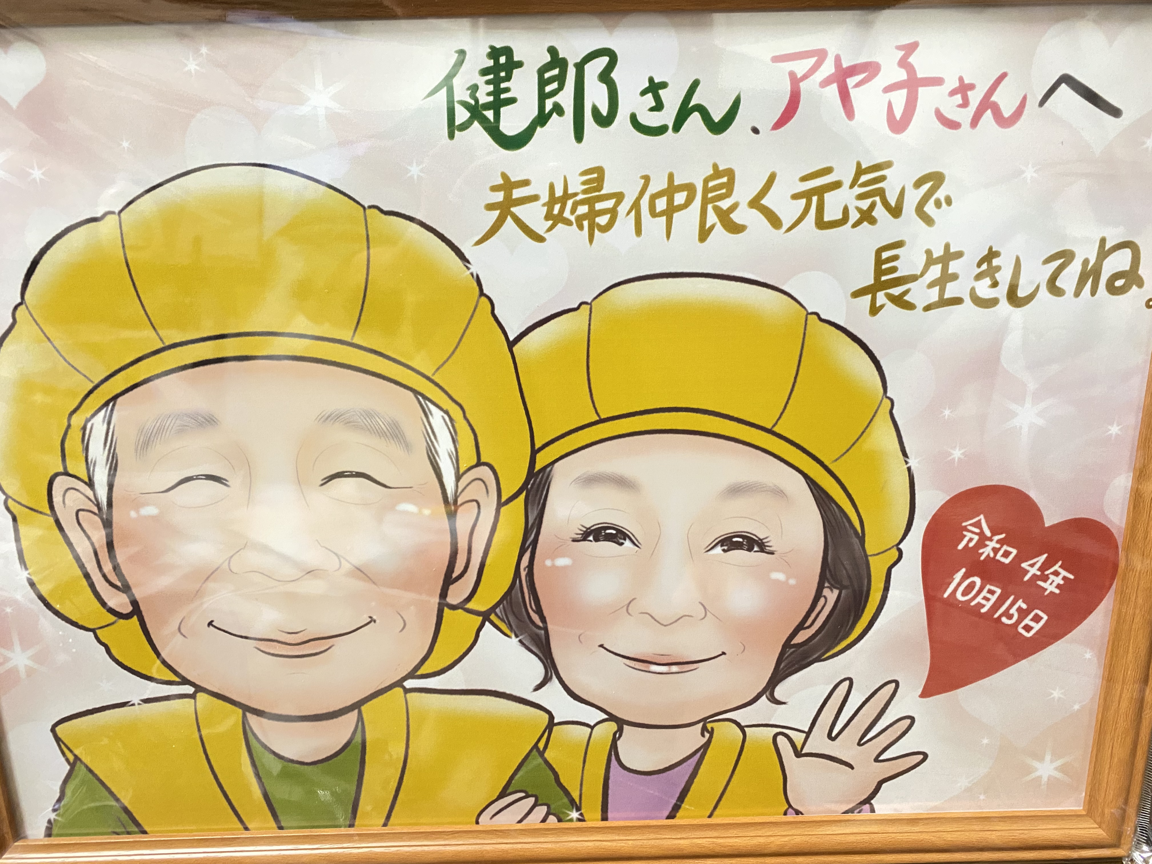 義理父母の金婚式のプレゼントに似顔絵をプレゼントします。当日サプライズで花束と書いていただいた似顔絵を渡す予定です。到着が間に合うかドキドキしましたが、この絵が届き箱を開けて思わず笑みがこぼれました。本当に似顔絵っていいですね また途中色々とご丁寧にご対応いただきありがとうございました。今度は私達の銀婚式の似顔絵をお願いしたいです。
