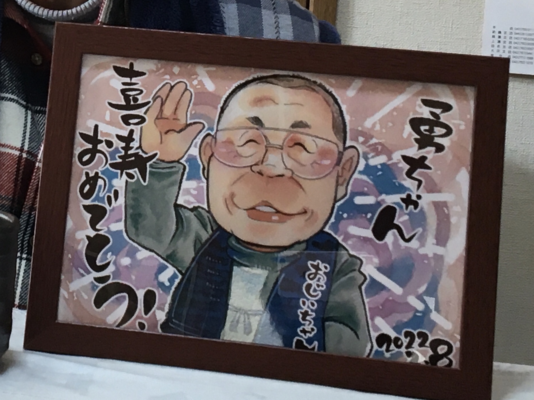 今回、コロナ禍の影響で約8年ぶりに親戚一同が集まるという事もあり、サプライズで子供・孫からのプレゼントとして発注させて頂きました。2家族分注文させて頂きましたが、とても鮮明な似顔絵で写真の特徴をしっかり捉えたクオリティーの高い似顔絵が手元に届きました。現代のカメラ・携帯カメラは鮮明な写りで顔の表情を映し出してくれますが、似顔絵の場合、蛍光色を使用することで写真には無い、色彩の表現を全面に映し出してくれるのでとても綺麗な作品だと感じました。お盆休みに渡すまで時間が待ち遠しいですが、似顔絵のフレーム(額縁)際に、子供・孫たちが写った写メを何枚か入れてみて、さらに似顔絵に花を咲かせてみようかと思います。ありがとうございました。