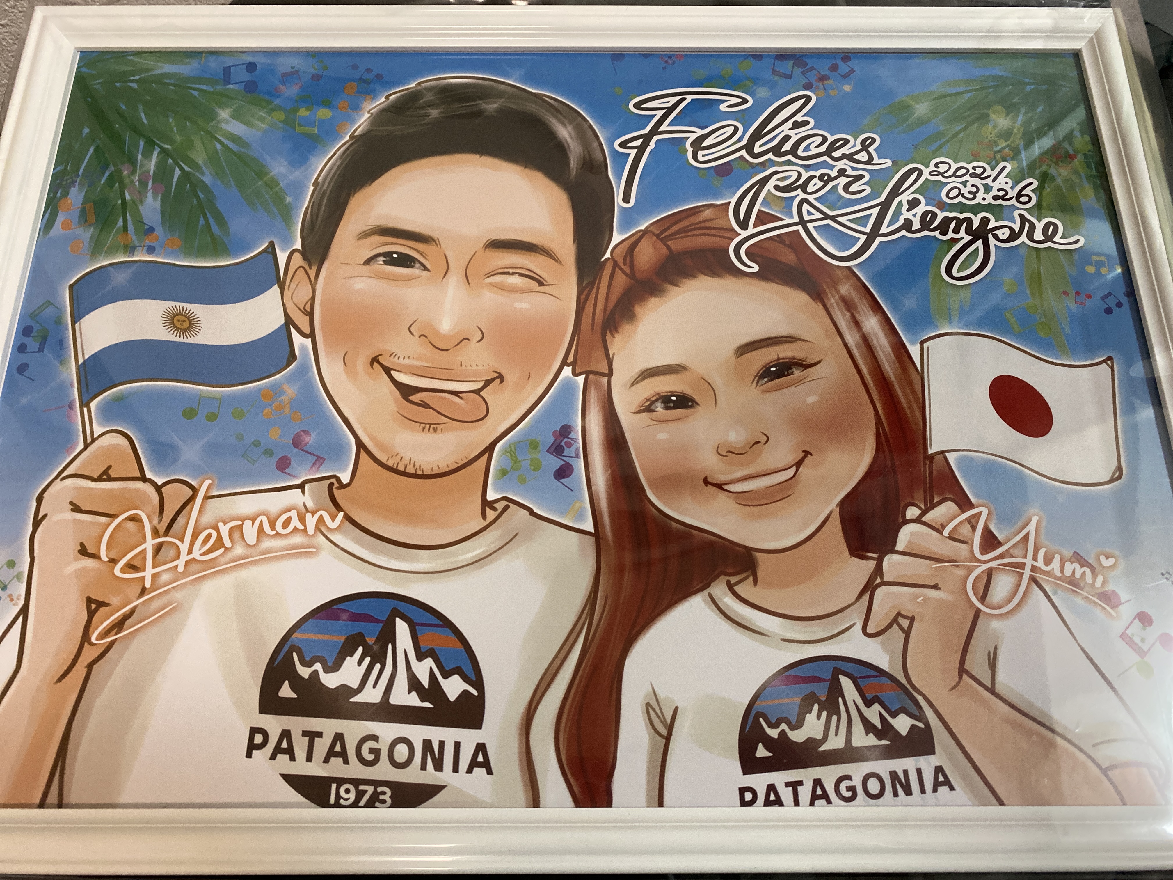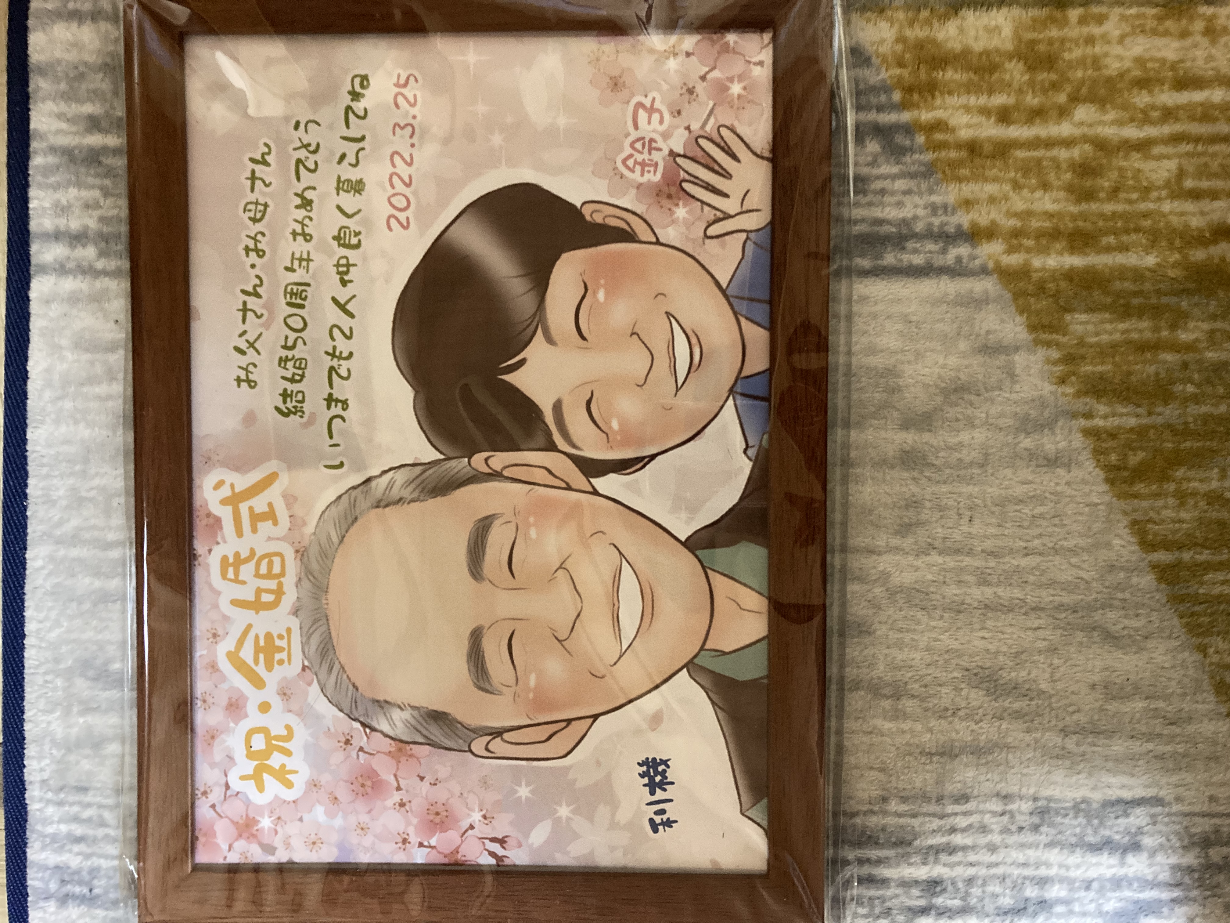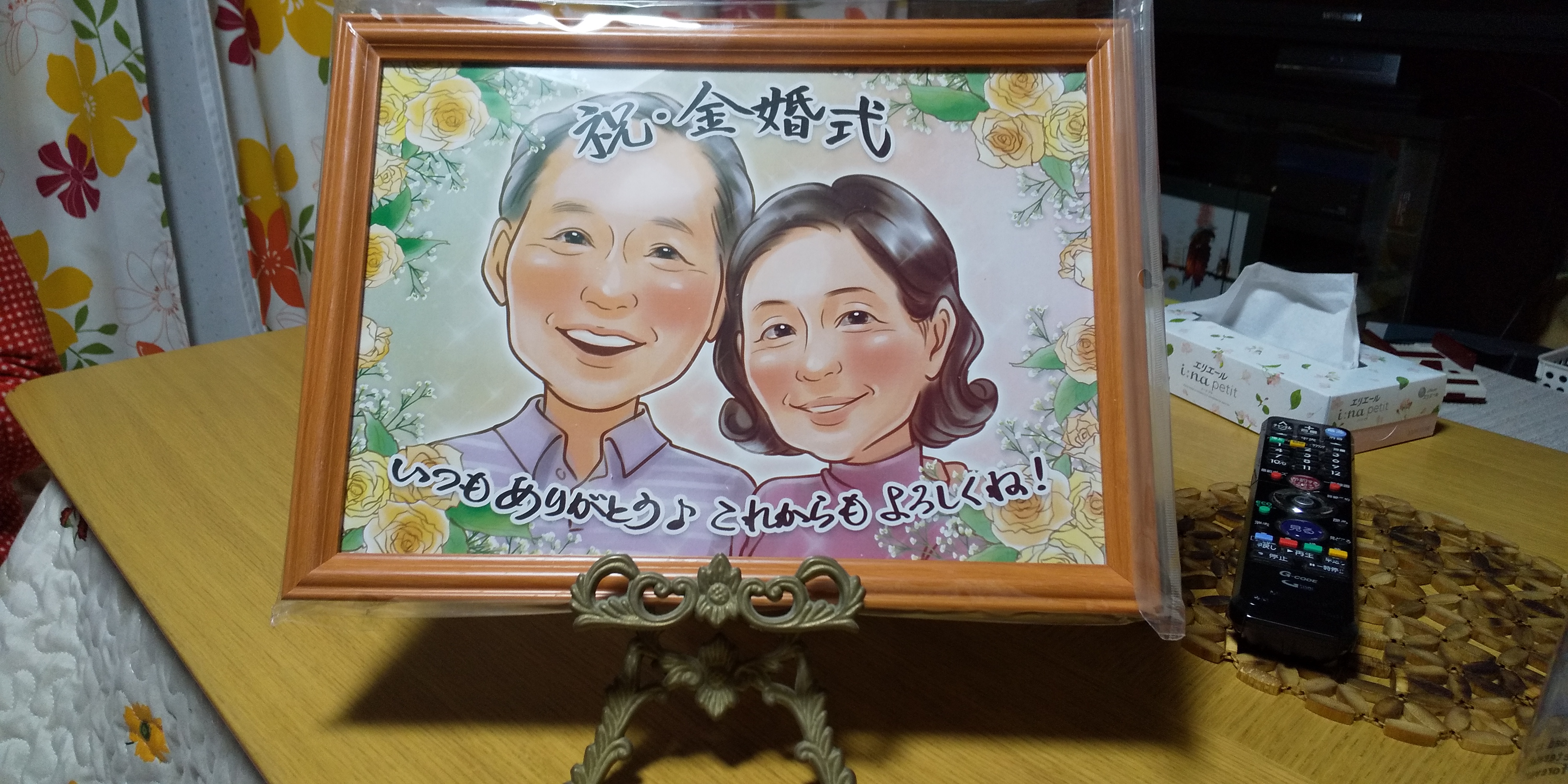 この度は、両親の金婚式のサプライズプレゼントとして、作成をお願いしました。出来上がりを見た、私を含め兄弟で似てると絶賛でした。似顔絵はもちろんですが、絵から見える2人の雰囲気も両親そのものでした。こちらの要望も思い通りにしていただき、思った通りでした。また、お願いしたいと思います。ありがとうございました。