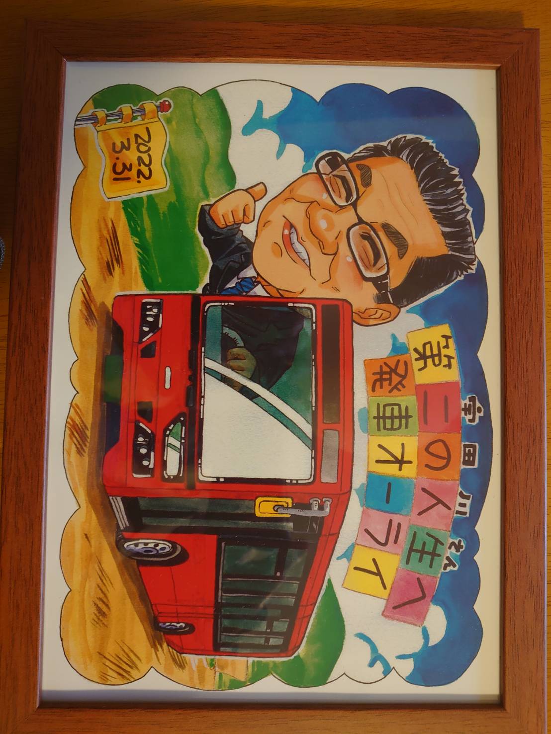 友人の60歳の退職祝い、と長年の夢だったバスの運転手への第二の人生の門出にお願いしました。イメージ通りに描いていただき、また、似顔絵も本人も友人一同納得の仕上がりでした。サイコーの贈り物が出来ました。周囲からは、よくこんな絵師を見つけたね。と誉められ、幹事冥利につきます。本当に感激でした!栞先生、短期間でご無理な対応、ありがとうございました。