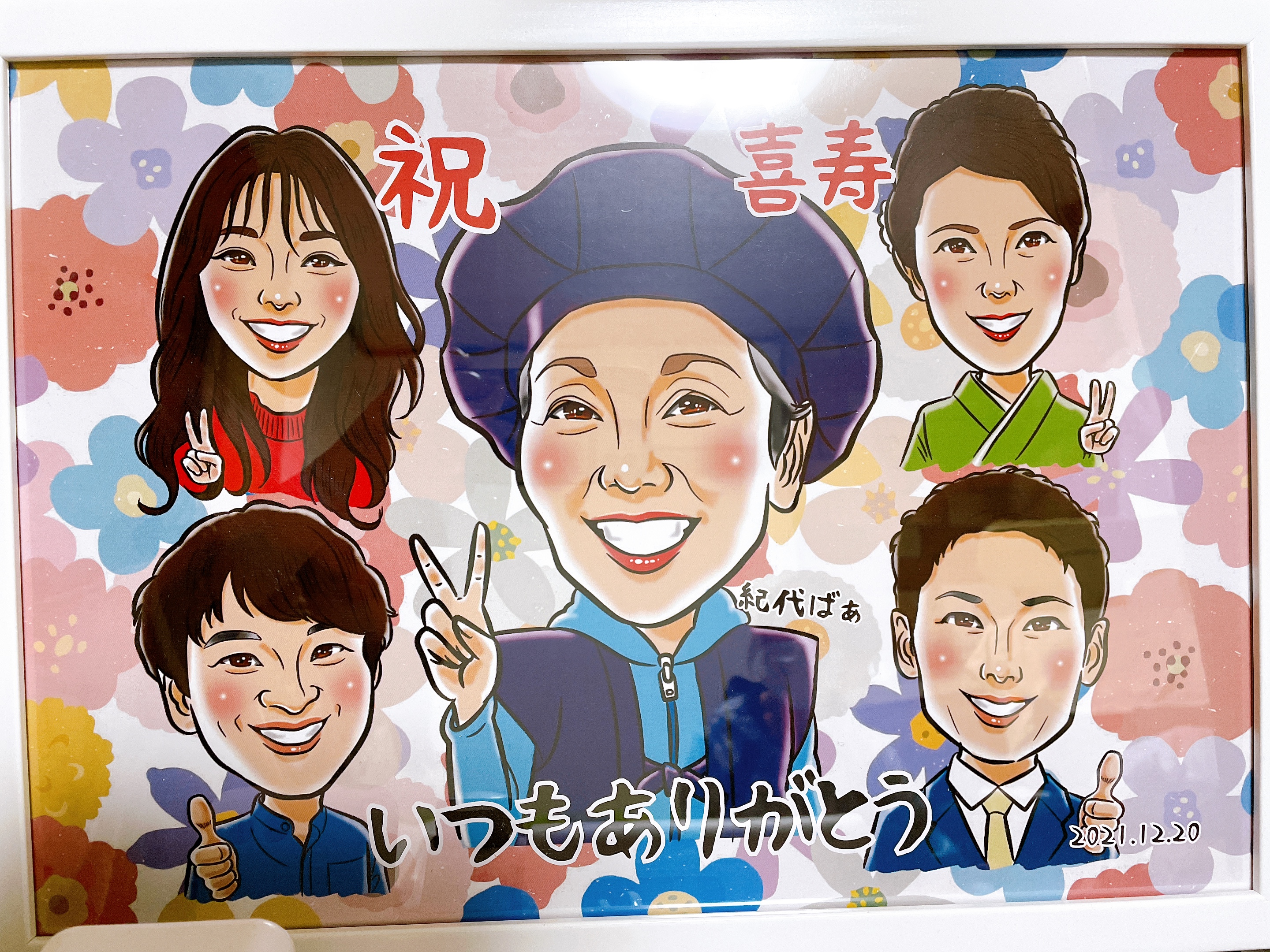 本当に早い発送でした!!日曜注文、金曜には手元に、土曜の米寿祝い当日に手渡すことができました!!暖かいタッチで描かれており、とても可愛らしかったです!祖父も喜んでおりました! 初めてイラストのプレゼントをしましたが、渡す方も貰う方も心がほんわりするので、イラストプレゼントいいものですね!これから活用しようと思いました!!