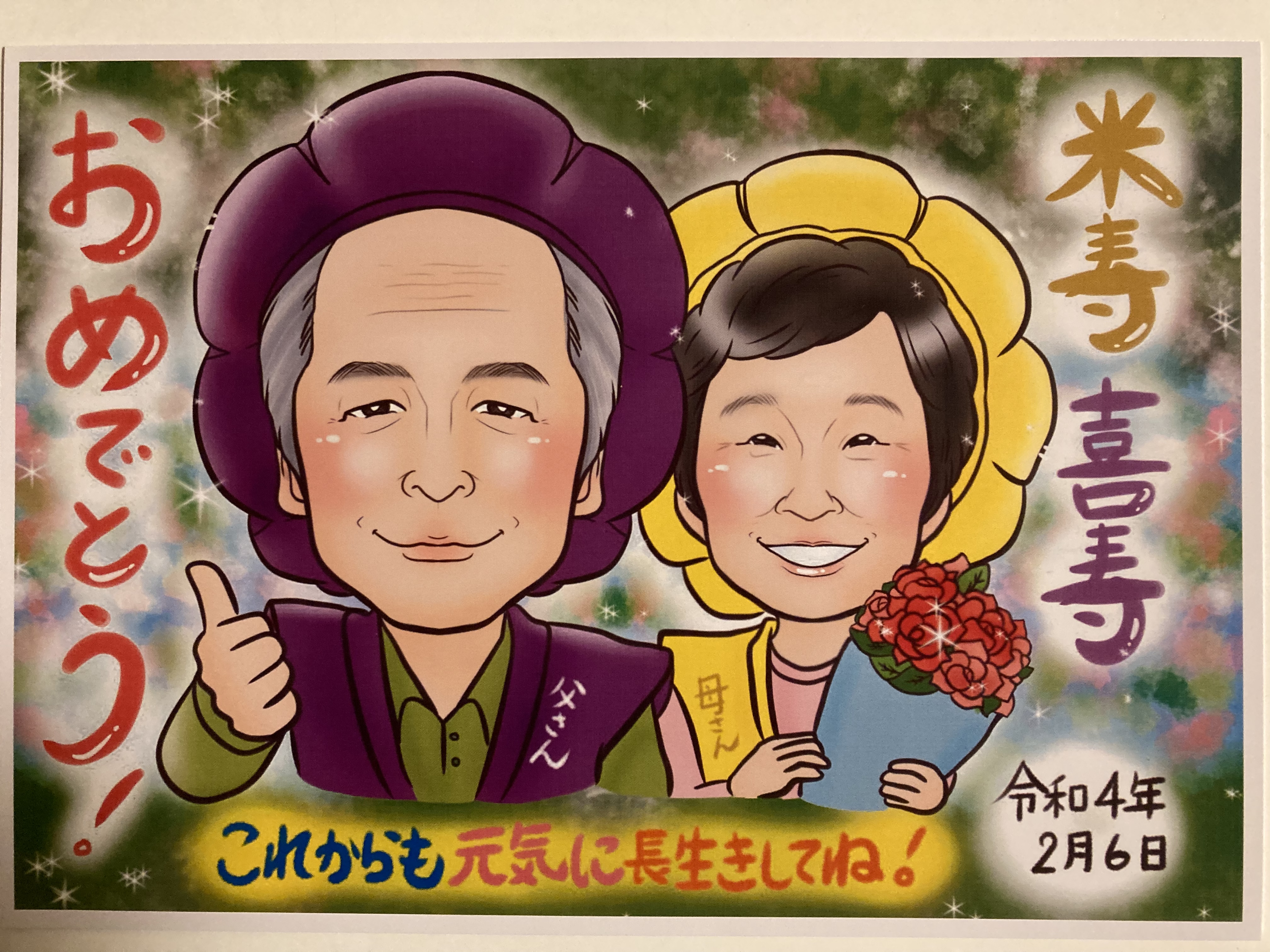 送った写真から顔の特徴をよく捉えて、満足のいく素敵な似顔絵でした。両親の長寿祝いを何にしようか考えていたのですが、インターネットで長寿祝いを検索したところ、似顔絵グラフィックスさんの似顔絵が目にとまり注文させて頂きました。きっと両親も喜んでくれるのではと思います。また機会が有れば、利用したいと思います。ありがとうございました。
