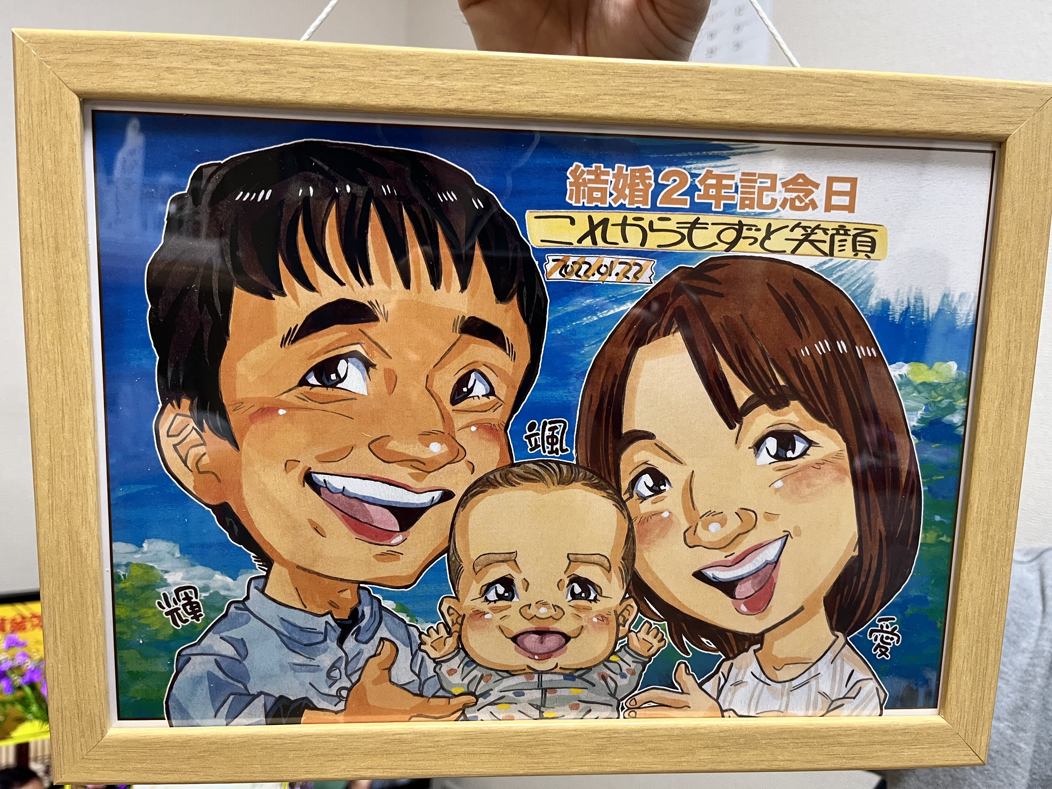 似顔絵ありがとうございました。はじめに見た時は、正直あまり似てないと思いました。特に赤ちゃんは眉毛がくっきりしているからなのか、外国人のように見えました。でもだんだん愛着が湧いてきて、見るたびに笑顔になれ、今はとても気に入ってます。リビングの壁に飾って毎日見ています。これからもずっと大切にします。ありがとうございました。