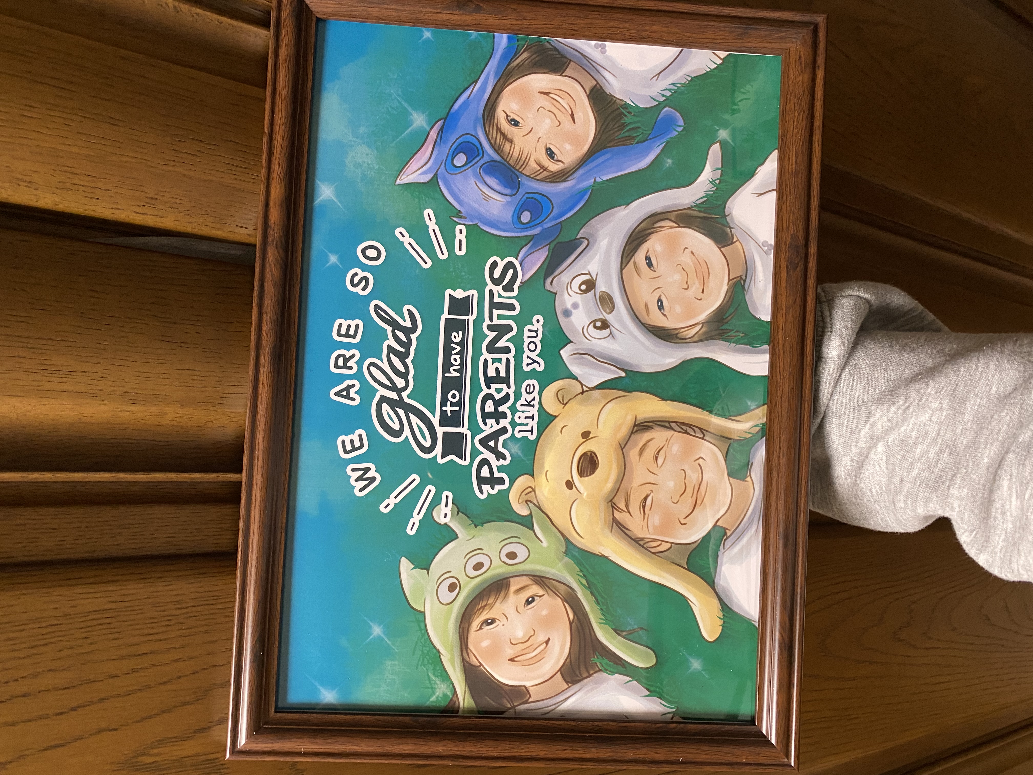 すごく幸せそうな両親が描けてて、ほっこりするような暖かい 雰囲気が伝わってきて大変気に入りました。 シワも減らしてあるので若々しくさらに幸せ感が伝わってきました。お願いした文字も想像していた感じに近く、一番伝えたいところが色を変えてあって可愛らしさもある雰囲気で仕上げていただきました。 また、何か機械があればお願いしたいです。