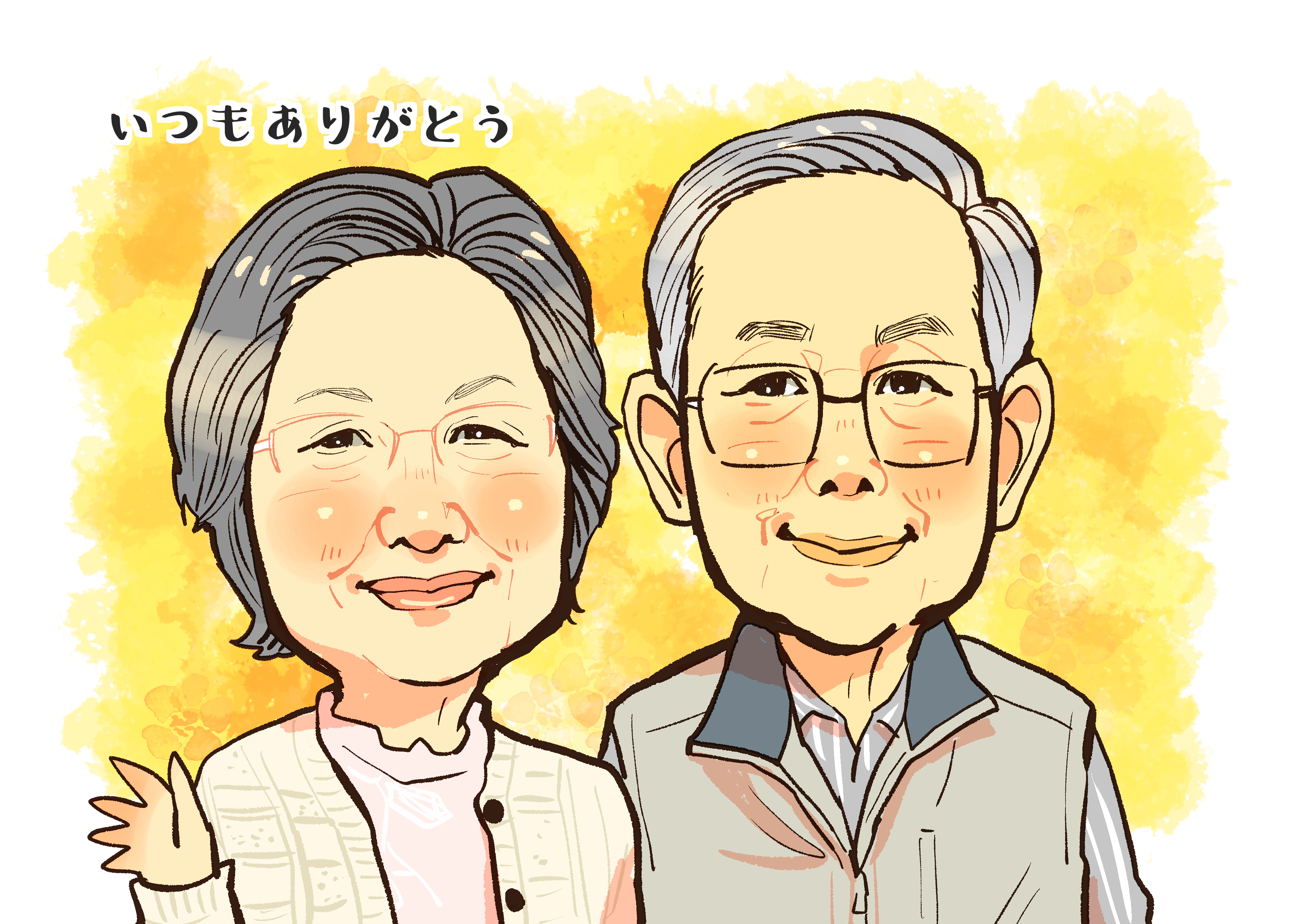 大好きなおじいちゃんとおばあちゃんの似顔絵を描いていただきました。 おじいちゃんおばあちゃんはもちろん、家族、親戚もとても喜んでくれました。これでもっともっと長生きしてもらいたいです。 背景もやわらかいあたたかい感じでとぼんやりとしか伝えられなかったのですがめちゃくちゃいい感じに描いていただいて本当に感謝の気持ちでいっぱいです。