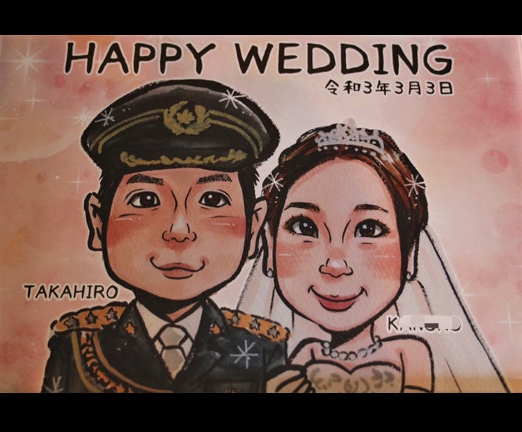 今回入籍用にお願いしました。 コロナ禍で結婚式が出来なかった分、似顔絵だけでも結婚感を味わいたく、礼服とウェディングドレスを着た設定で描いていただきました。 直近で頼んだにもかかわらずとても丁寧にご対応いただき、晴れやかな気持ちで入籍の日を迎えることができました。 二人にとっての素敵な宝物をありがとうございました。