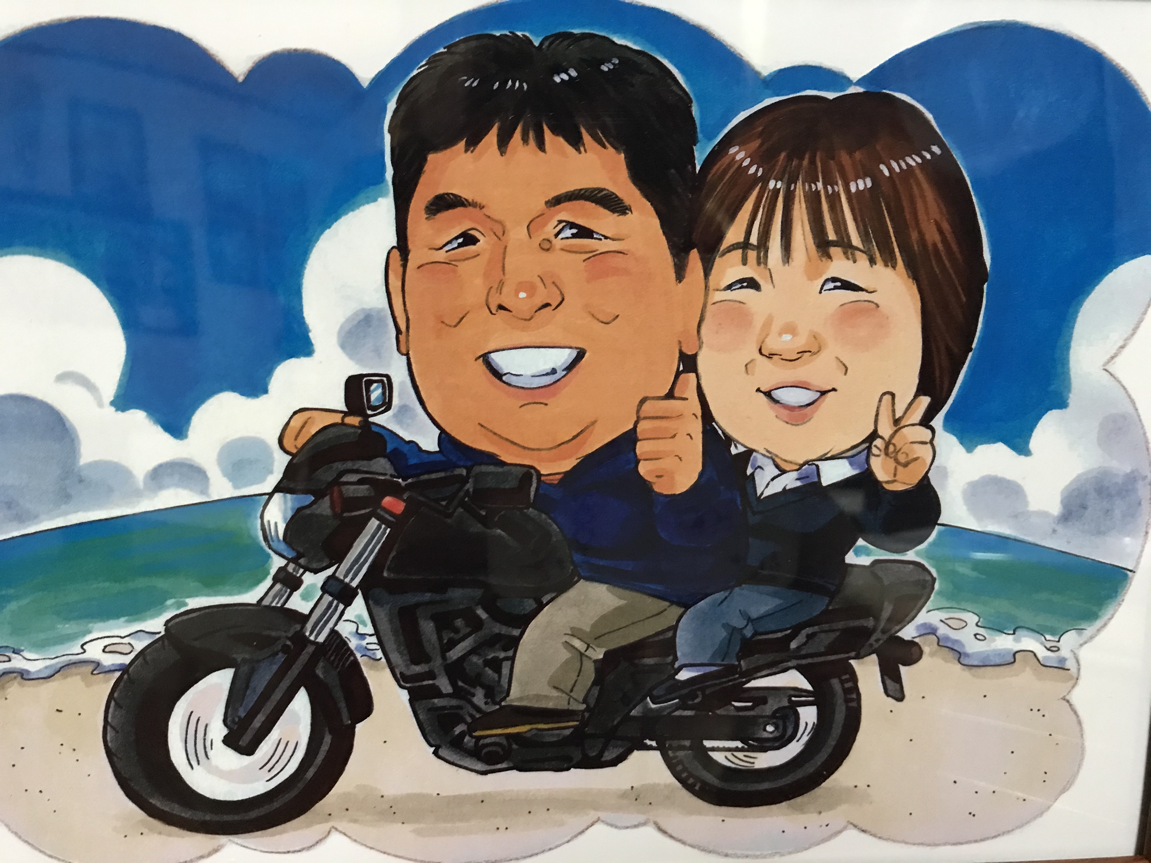 はじめての利用で、しかも参考になる写真が一枚しか用意できなかったのですが、アンケートページで服装やポーズなどが指定できた事で、似顔絵師さんの作品から連想した希望どうりのデザインで描いていただく事ができました。また似顔絵に関しましては、目元や輪郭の特徴を上手く、そして可愛く描いていただき非常に満足のいく作品だったと思います。是非また利用したいと思っています。 今回は本当にありがとうございました。