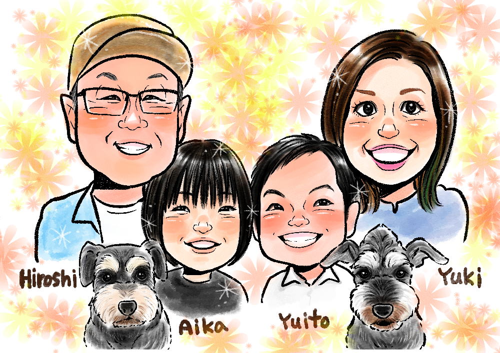 素敵な似顔絵ありがとうございました。 家族みんなとっても喜んでくれました。 犬の絵が写真を見ている程そっくりで驚きました。