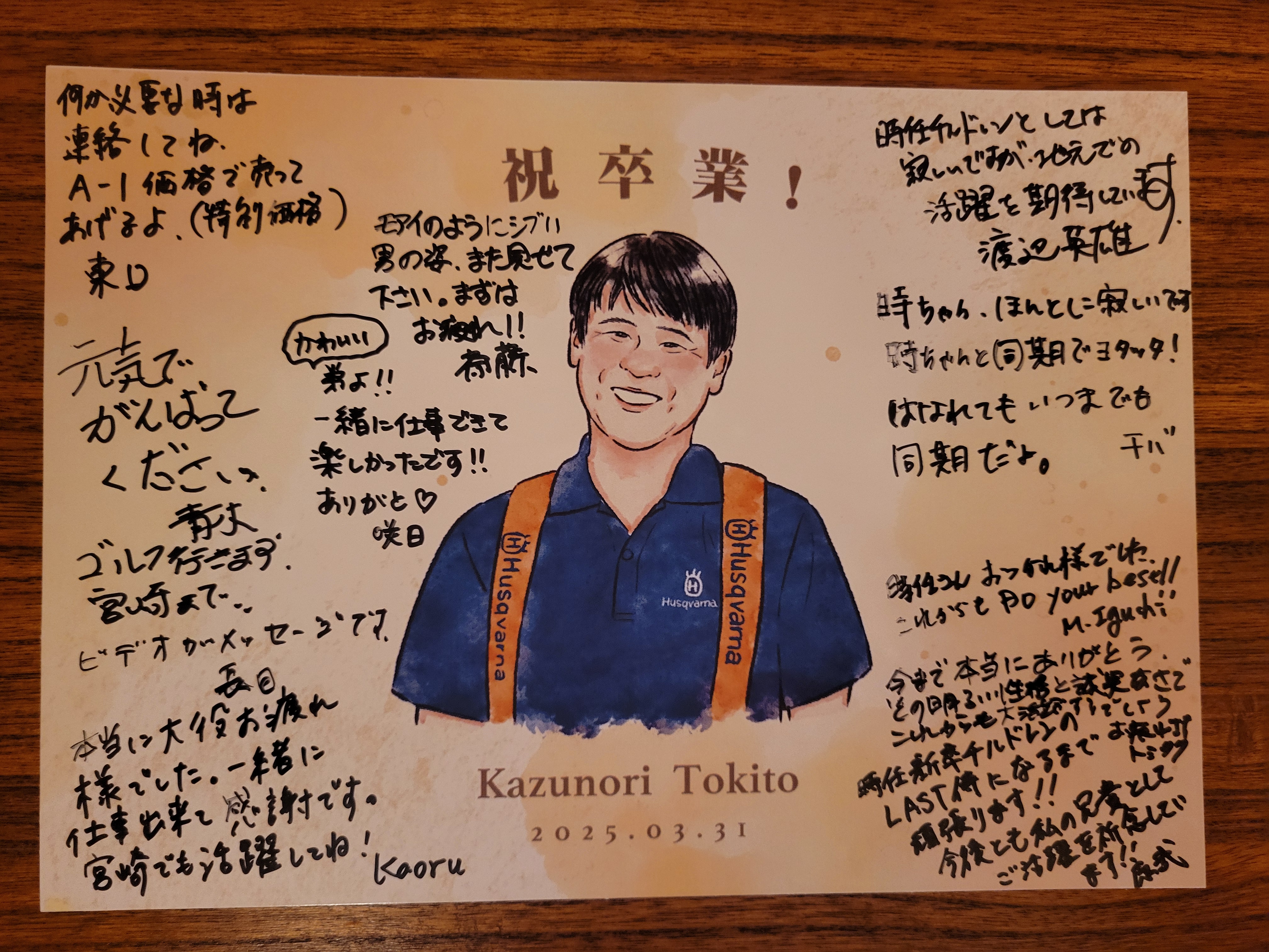 優し気な雰囲気の素敵な似顔絵で大満足です!しかも納品までの時間も早くおかげで週末の送別会に余裕で間に合いました。ありがとうございます。 似顔絵の周りに皆でメッセージを入れて送別会で渡しましたが、とても喜んでくれ私たちも嬉しかったです。今回は会社の同僚への贈り物でしたが、プライベートでも使いたいと思っています!