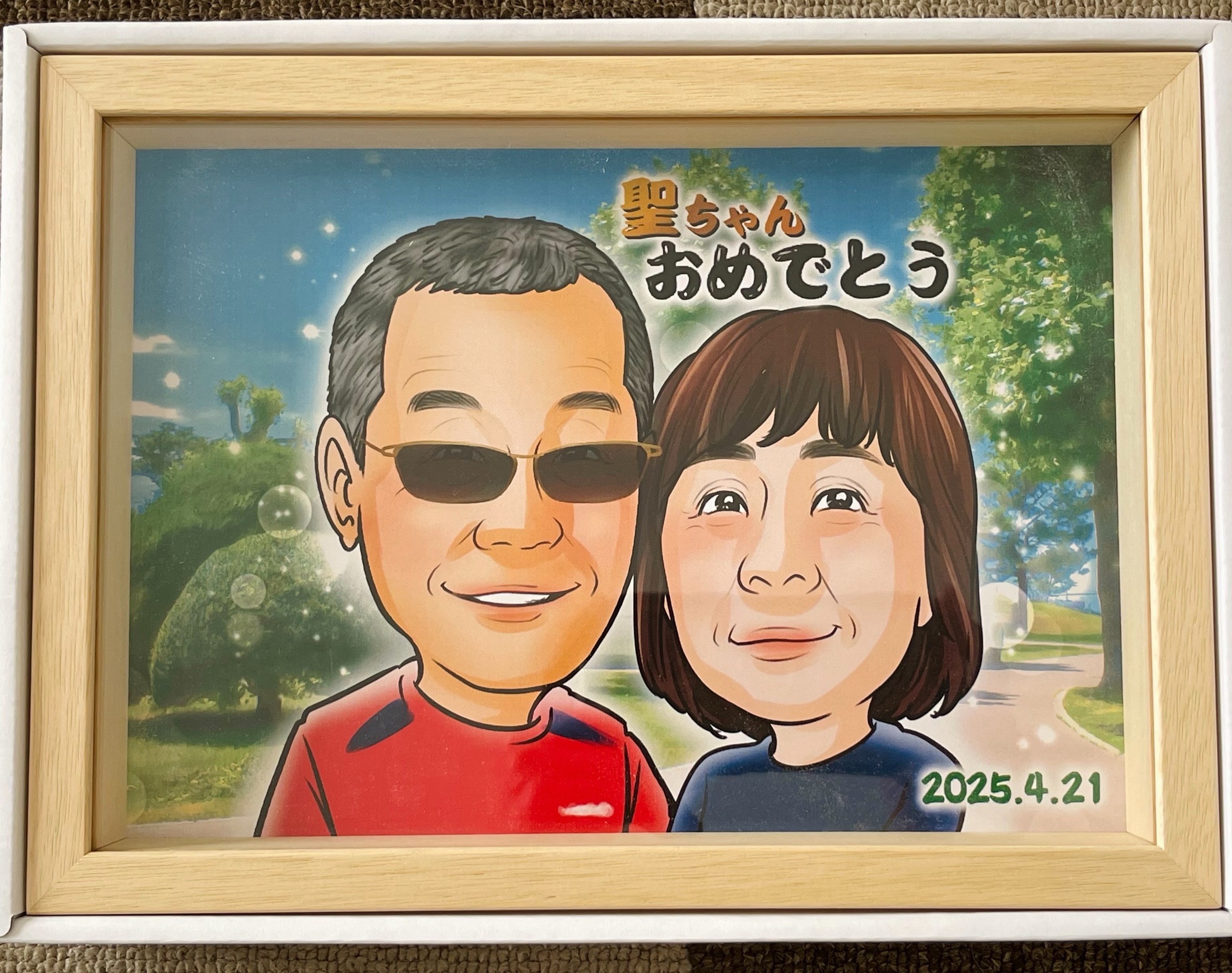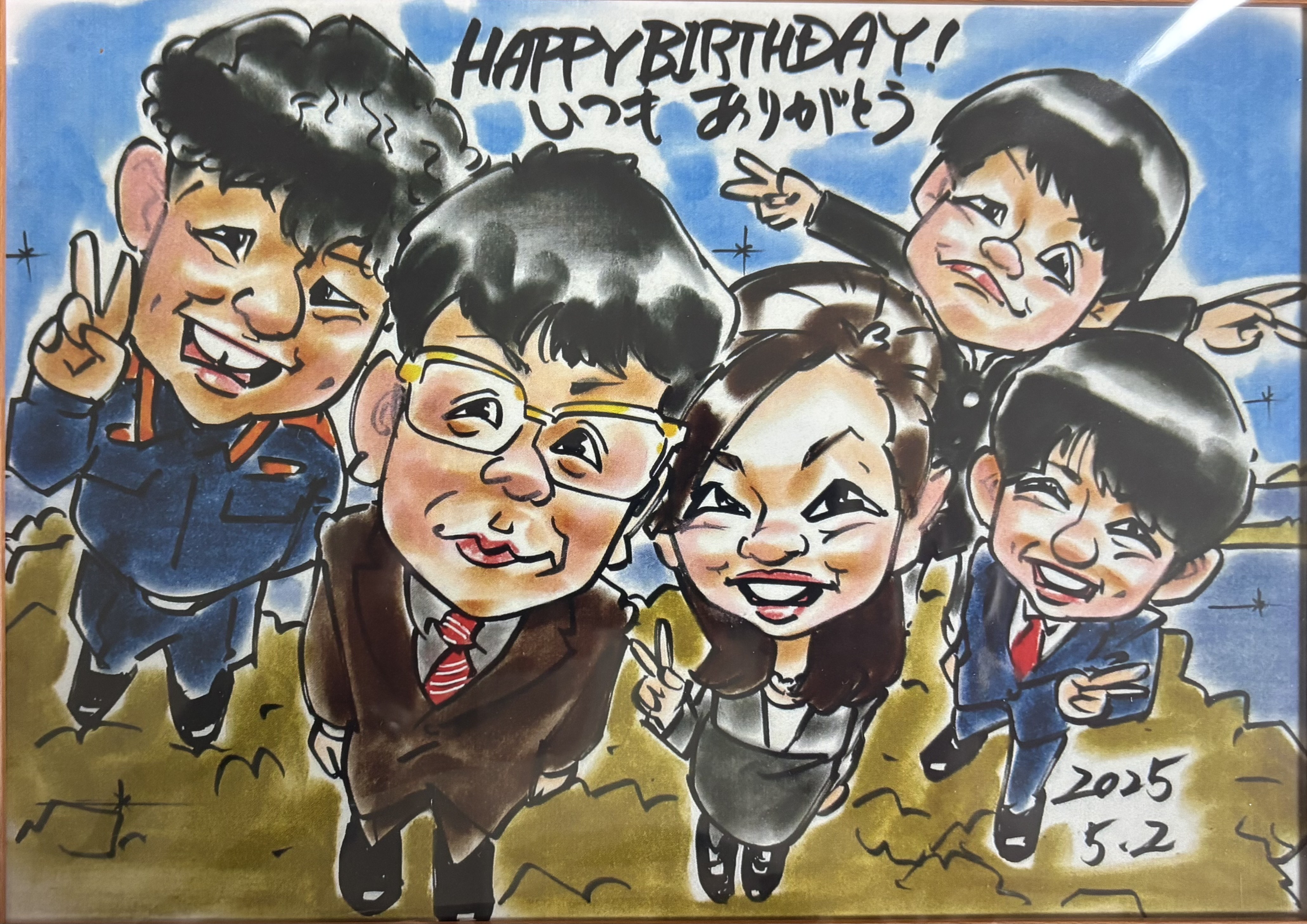 いつも誕生日や入学、いろんな記念日にお世話になってます。今回は毎年恒例の誕生日にお願いしました。貰う方も似顔絵に期待しつつ楽しみにしてるみたいです。毎回ながら期待以上の出来栄えに嬉しく思います。贈った側も貰う側も笑顔になる作品に感謝です。年に数回しか頼めないですが、これからも記念日にはお願いしたいです。