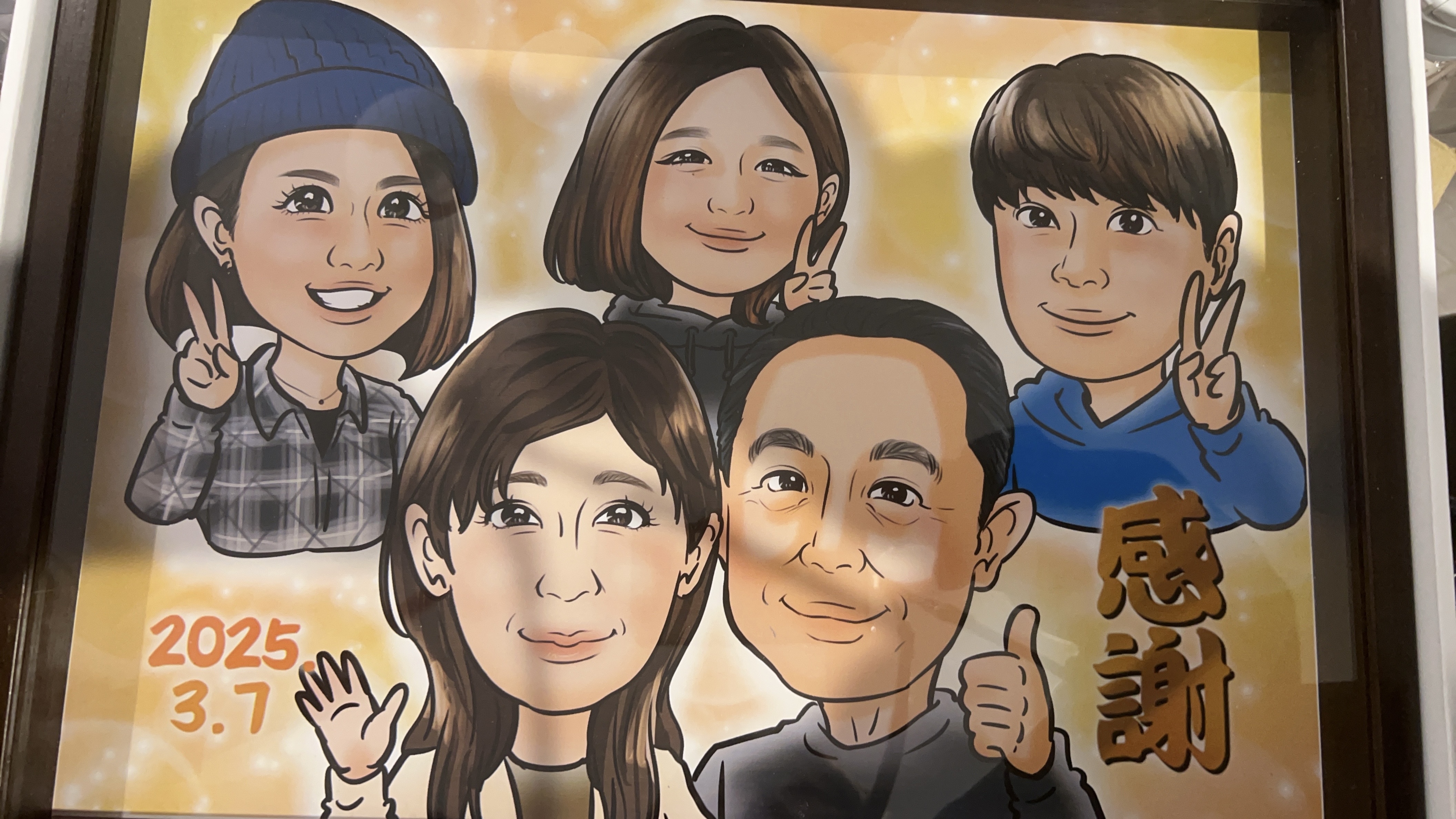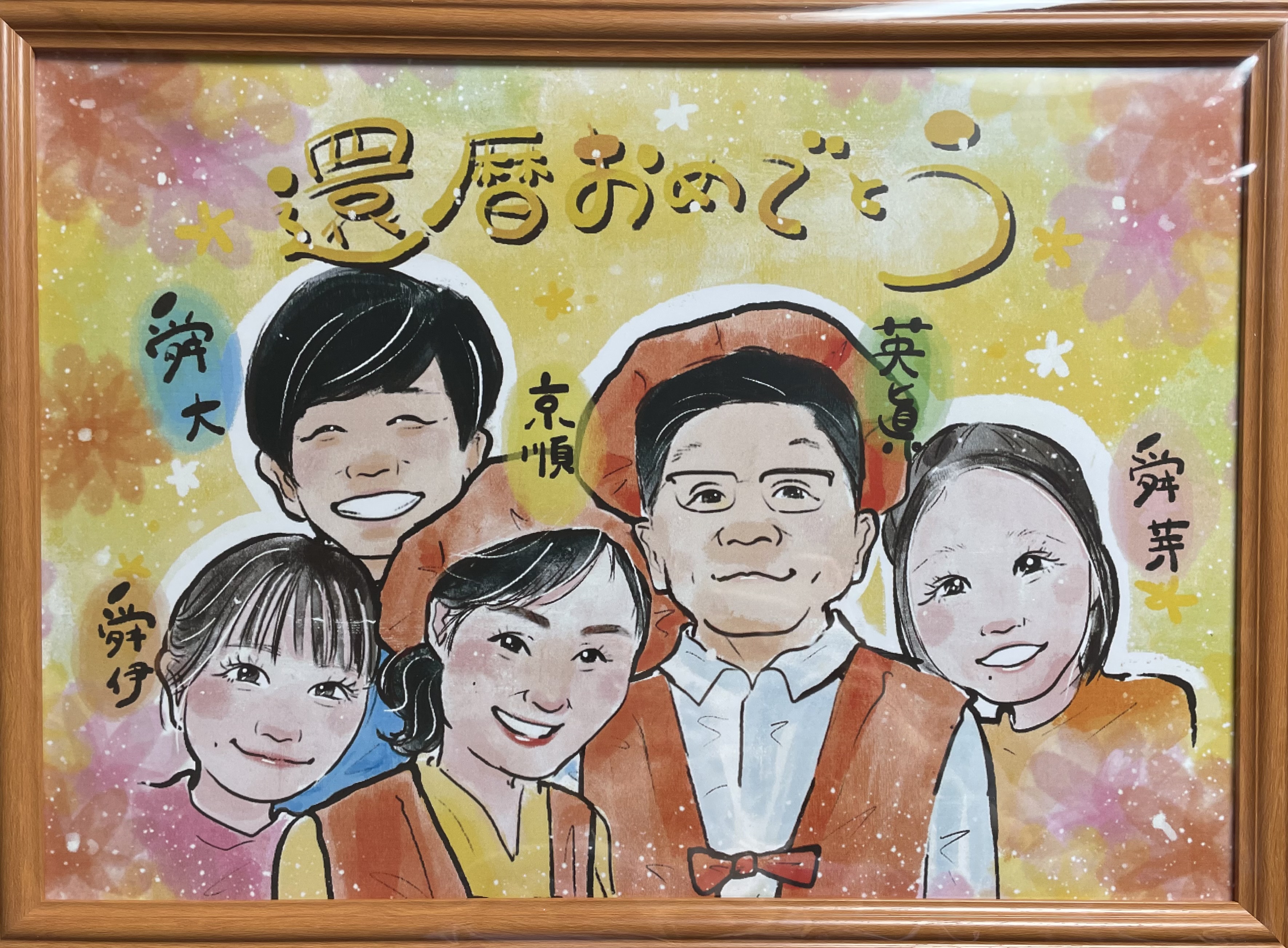 今回母の還暦祝いの贈り物で利用しました。似顔絵を描いてもらうのがはじててで、家に届くまでとってもワクワクしました。作品、めっちゃ可愛かったしそれぞれ人物の特徴捉えててそっくりでした〜!今回プレゼントで注文しましたが私が欲しくなってしまうぐらい(笑)また利用させてもらおうとおもいます!迅速にご対応いただき、また素敵な絵をありがとうございました!